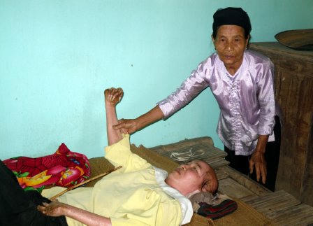 Ngôi nhà cấp bốn nằm sát ven đồi là gia đình anh Bùi Văn Độ sinh năm (1966). Trong dáng vẻ yếu ớt, làn da nhợt nhạt anh Độ cố gượng ngồi dậy tiếp chuyện. Vì bị bệnh nên chân tay anh bủn rủn, da vàng nhợt nhạt. Trong lúc nói chuyện anh ngồi nhìn chúng tôi chăm chăm như đang khao khát đến một sự sống cháy bỏng. Do phát hiện sớm nên hiện tại anh đang phải uống thuốc bắc để duy trì sự sống từng ngày. Anh Độ rơm rớm nước mắt bảo: “Đi khám bác sỹ bảo tôi bị teo gan, giờ uống thuốc bắc nhưng vẫn không đỡ, trong người cảm giác các dây thần kinh cứ co lại đau nhức và thở khó lắm anh à”.