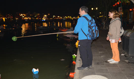 | Du khách thả hoa đăng với mong muốn ước nguyện Tết nguyên tiêu nhiều tốt lành, hạnh phúc (ảnh Lê Trí) |