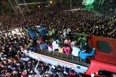 Không nằm ngoài dự đoán, bắt đầu từ 19h ngày 31/12, "biển người" đã chật cứng quanh Hồ Gươm. Những chiếc xe “màu đỏ” đặc trưng của lực lượng cứu hỏa đã có mặt tại một số điểm được coi là trọng yếu để ứng trực cứu nạn, cứu hộ, chữa cháy. Và dòng người như nêm đã nhanh chóng vây quanh bờ Hồ Gươm.