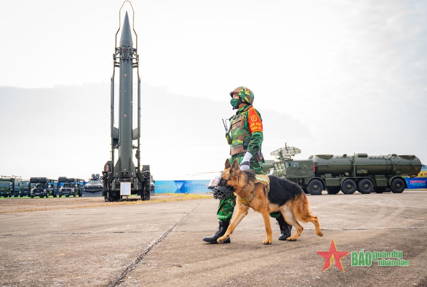 Lực lượng kiểm soát quân sự và quân khuyển biên phòng làm nhiệm vụ đảm bảo an ninh tại triển lãm.