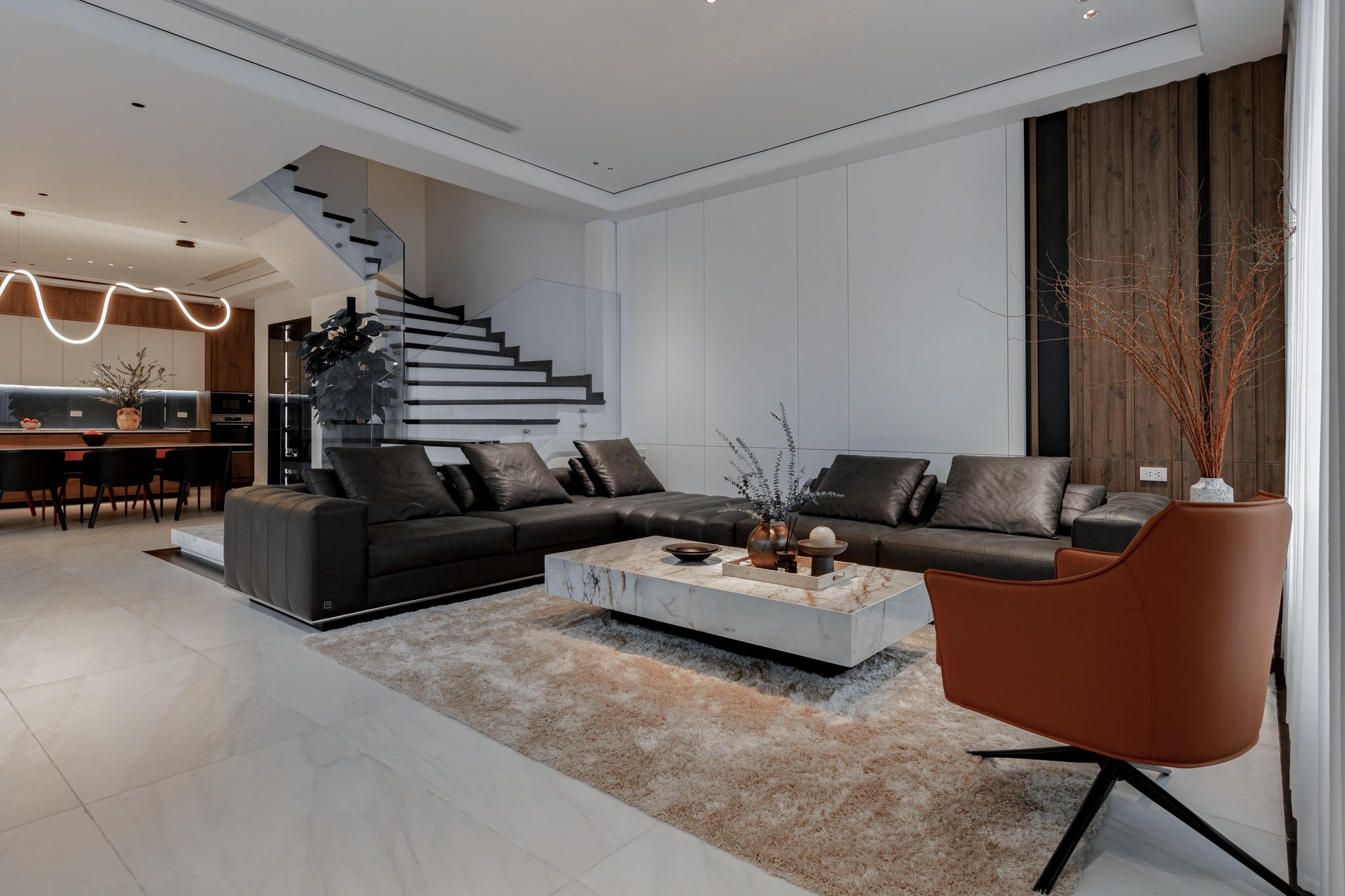 Bên cạnh đó, không gian trong nhà còn gây ấn tượng với thị giác nhờ cách sử dụng màu sắc tương phản (trắng – nâu - đen) trong thiết kế nội thất tại các phòng ở. KTS đã không máy móc mà sử dụng hợp lý, linh hoạt nhiều loại vật liệu như: đá, bê tông, gỗ, kim loại, kính,... để tạo nên các chi tiết khác nhau trong nhà. Nhờ vậy, các phòng ở dù được thiết kế khá đơn giản nhưng vẫn không hề nhàm chán mà khá độc đáo, ấn tượng.