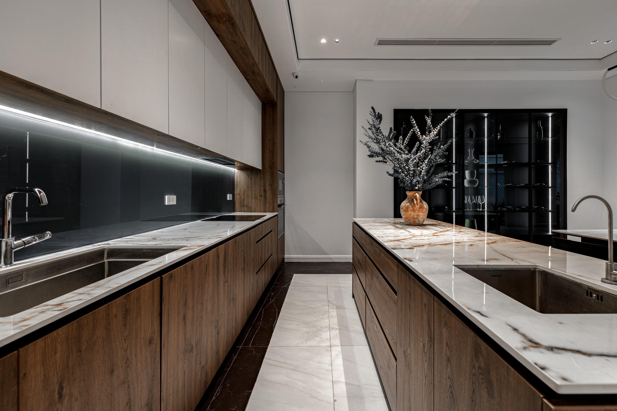 Khu vực bếp rộng 6m, toàn bộ được ốp bằng đá và gỗ mang tông màu trầm tạo sự sang trọng, sạch sẽ vầ ấm cúng cho không gian bên trong. |
