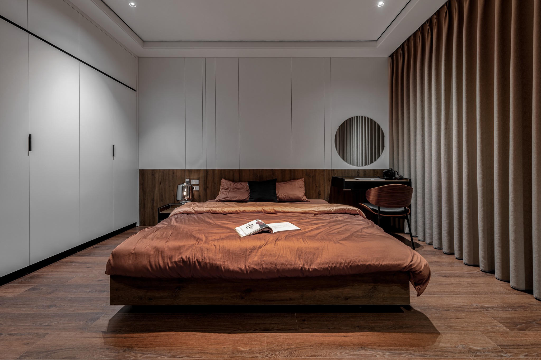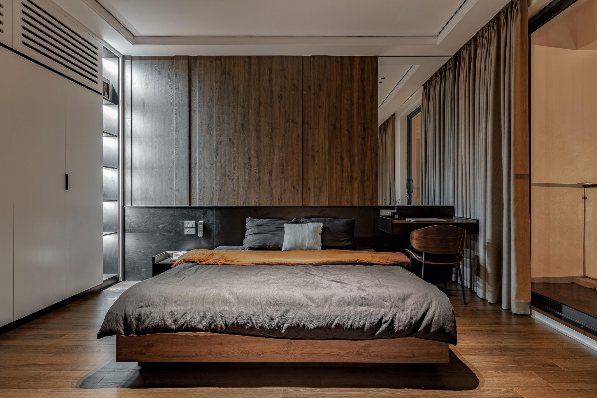 Trong khi đó, tại gian phòng ngủ của bố chồng chị Ngọc được thiết kế tương đối đơn giản, chỉ có giường tủ, bàn làm việc và kệ ti vi. Còn phòng ngủ của vợ chồng chị Ngọc thì do nhu cầu chủ yếu để ngủ và sống ảo nên chị Ngọc trang trí thêm một giá sách và ghế để thư giãn và chụp ảnh sống ảo.