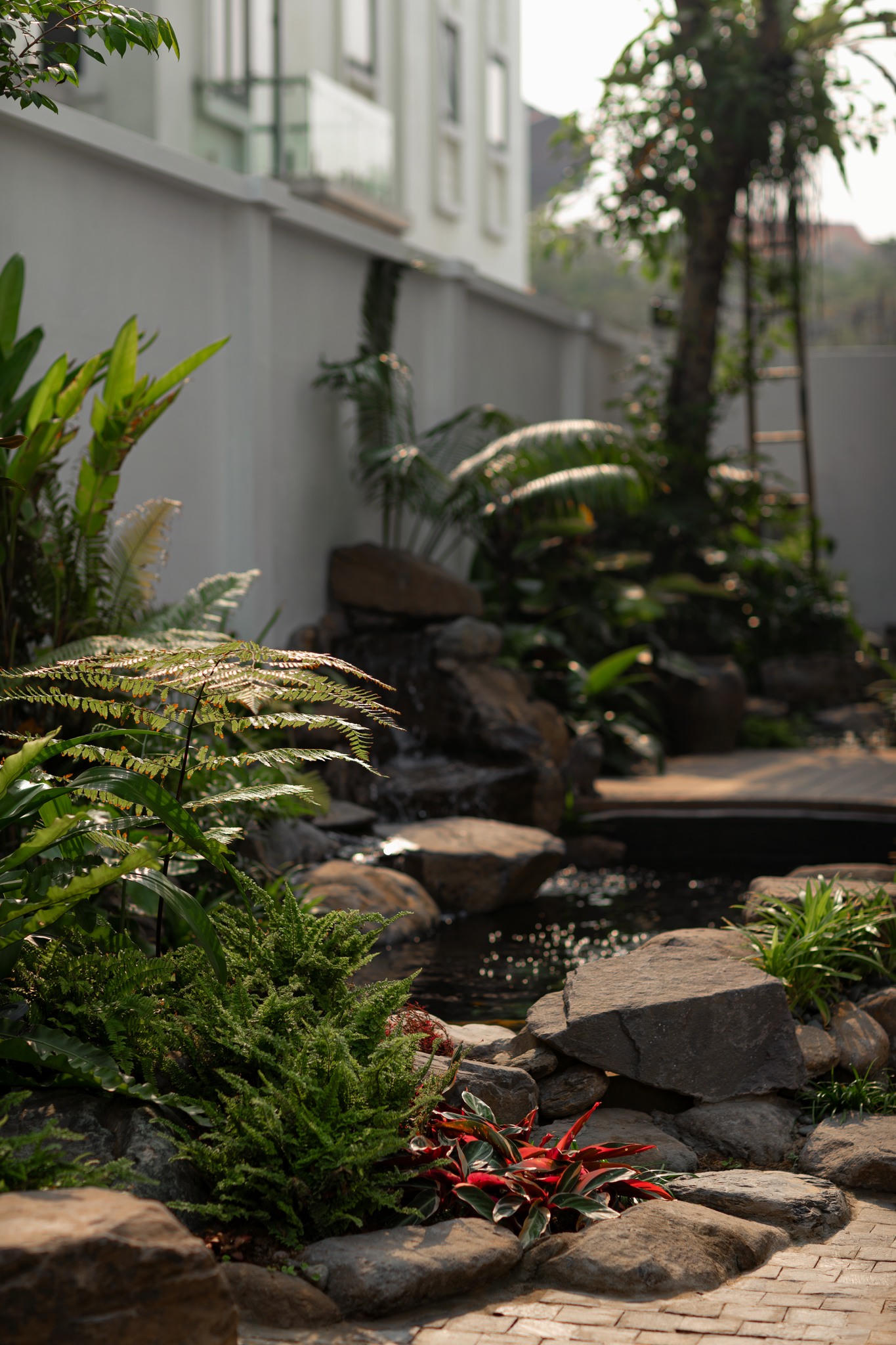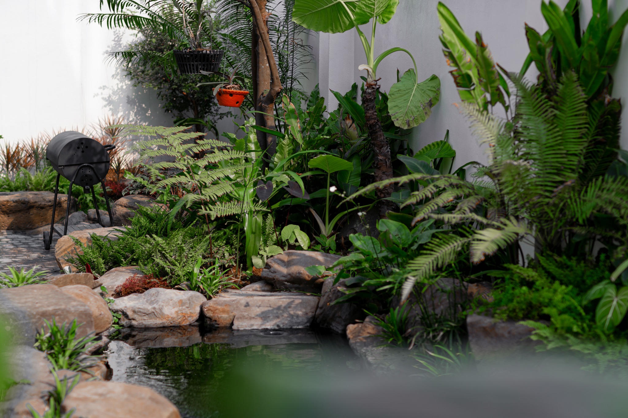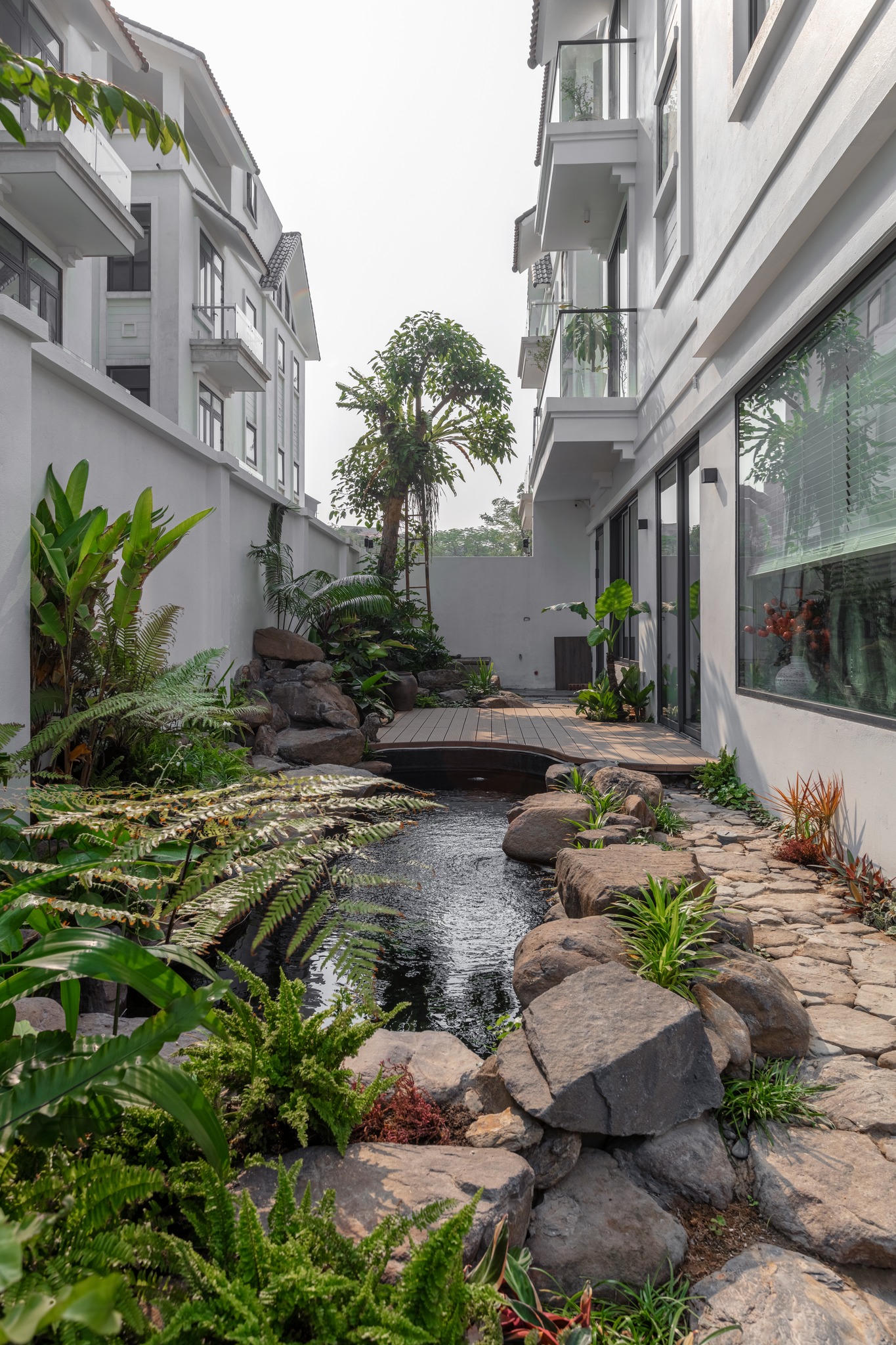 Mong muốn tạo nên một không gian sống bình yên, mát mẻ và thoải mái đã thôi thúc chủ nhà tạo ra một “hệ sinh thái” với cây xanh, ao cá trong khu vườn nhiệt đới rộng 100m2. Bên hông nhà ngoài ao cá rộng 20m2 là vị trí khu sàn gỗ để gia chủ ngồi chill và cho cá ăn.