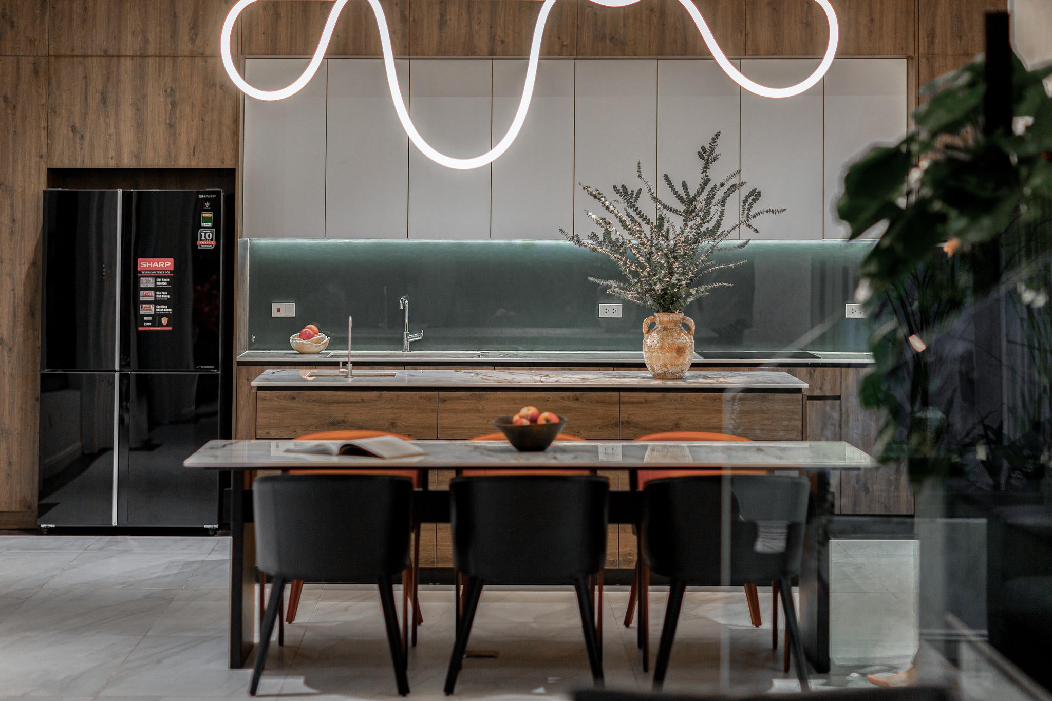 Thông với phòng khách là khu bếp. Điểm nhấn là bản đảo bếp dài 2,5m. |