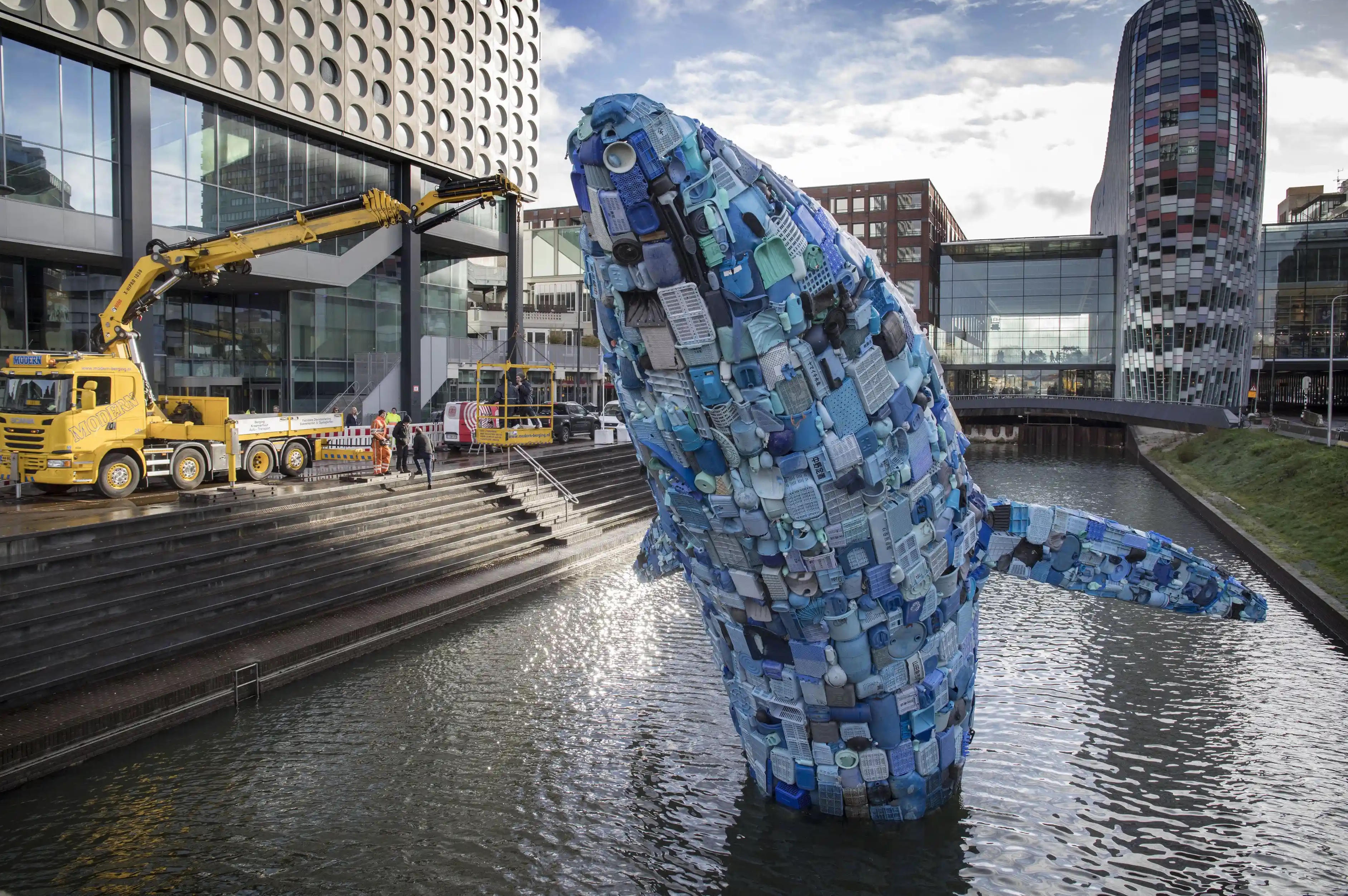 Tác phẩm điêu khắc cá voi cao 12m được tạo bởi 5 tấn nhựa từ Thái Bình Dương được trưng bày ở Catharijnesingel, thành phố Utrecht (Hà Lan) năm 2019. Ảnh: Hollandse Hoogte.