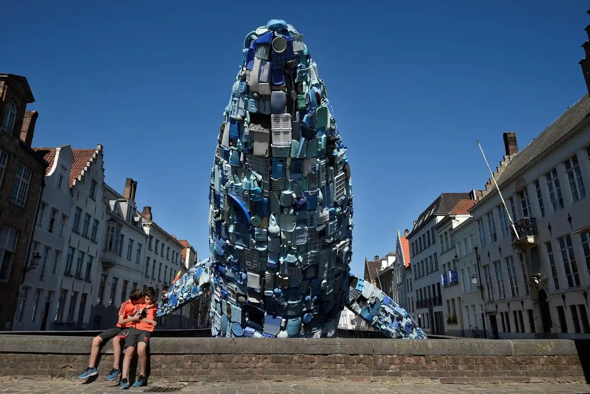 Một tác phẩm điêu khắc một con cá voi cao 12 mét được tạo ra từ 5 tấn nhựa đại dương tái chế đã được trưng bày tại Bruges vào năm 2018. Ảnh: John Thys/AFP.
