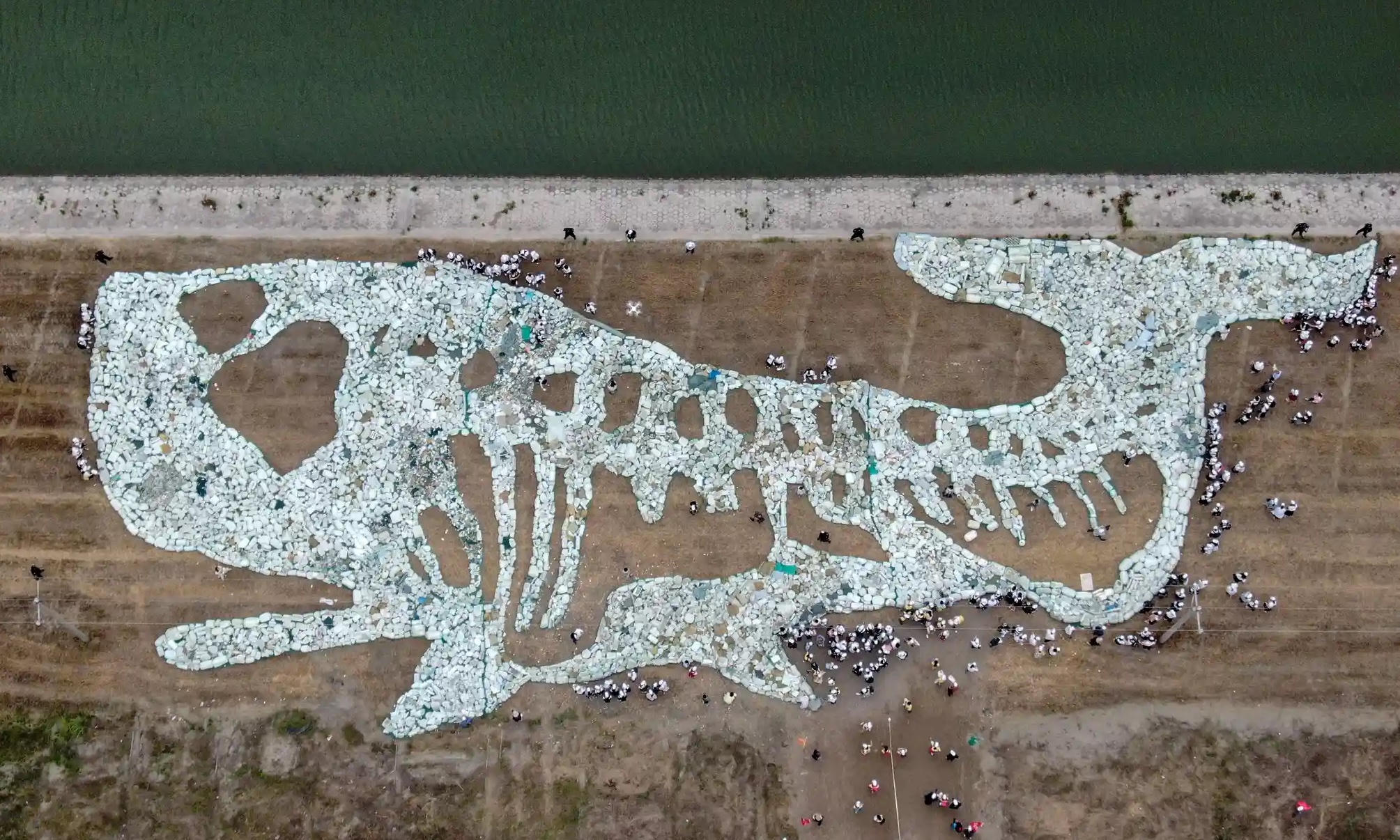 Hình ảnh một con cá voi dài 68 mét được tạo thành từ rác thải nhựa thu gom từ đại dương nhằm nâng cao nhận thức về bảo tồn biển tại cảng Rudong Yankou ở tỉnh Giang Tô (Trung Quốc) năm 2019. Ảnh: AFP.