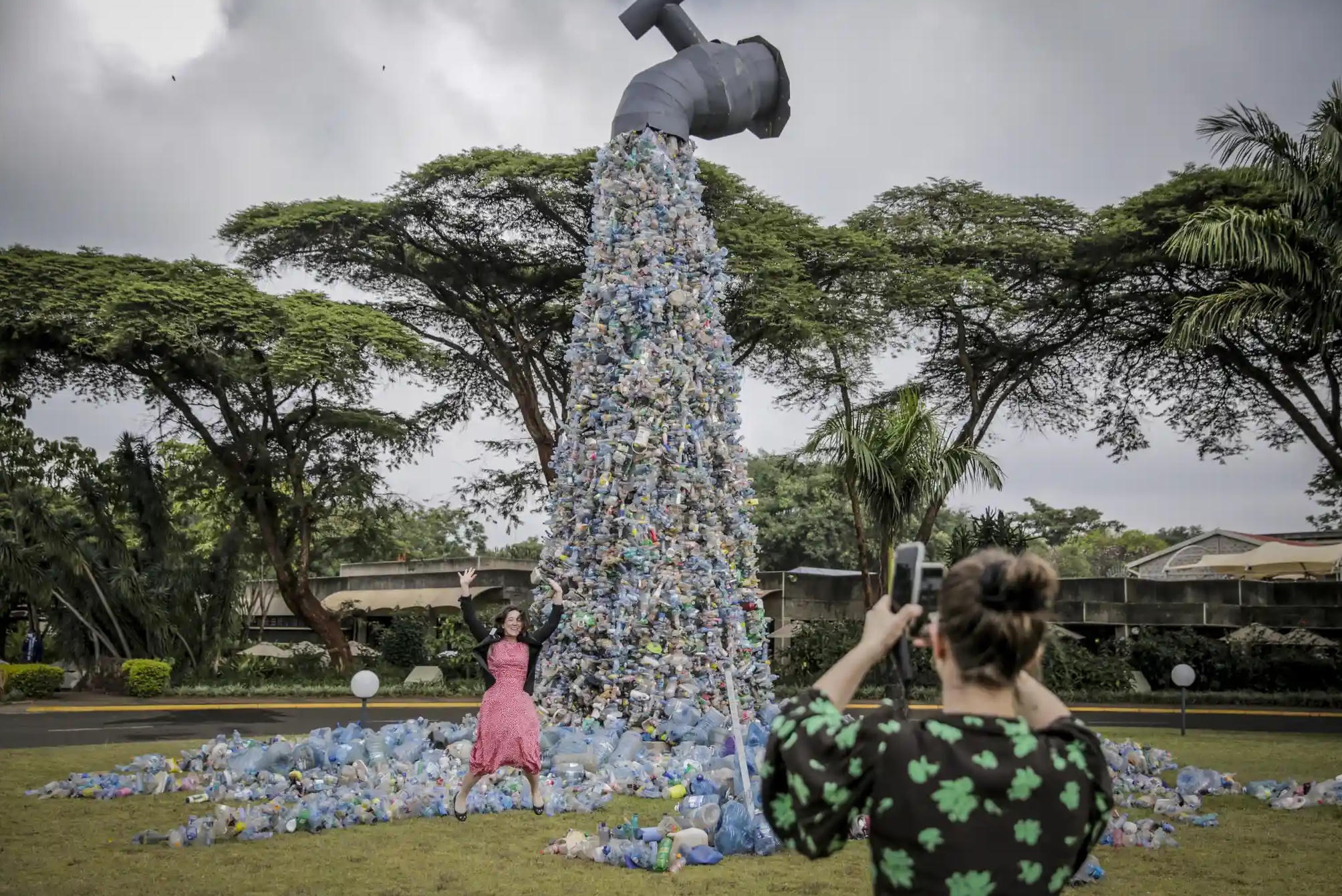 Một tác phẩm điêu khắc khổng lồ hình vòi rót từ các chai nhựa được thu thập từ quận Kibera của Nairobi vào năm 2022. Ảnh: Brian Inganga/AP.