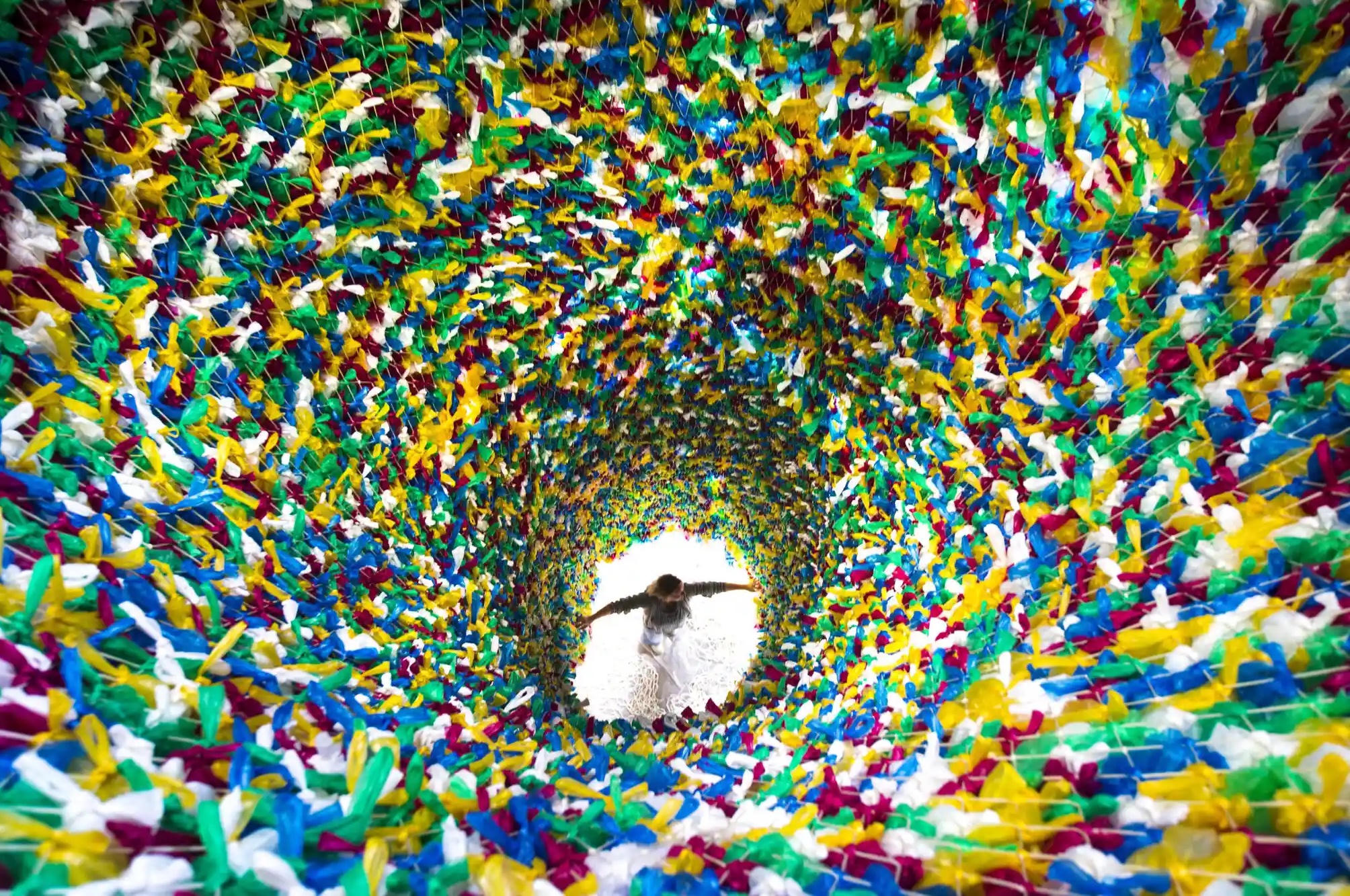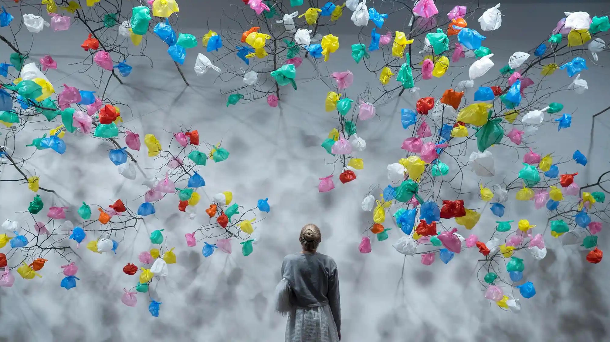 Bức tranh "Túi nhựa" của nghệ sĩ người Cameroon Pascal Martin Tayou ở Leiden (Hà Lan) vào năm 2015. Ảnh: Jerry Lampen/EPA.