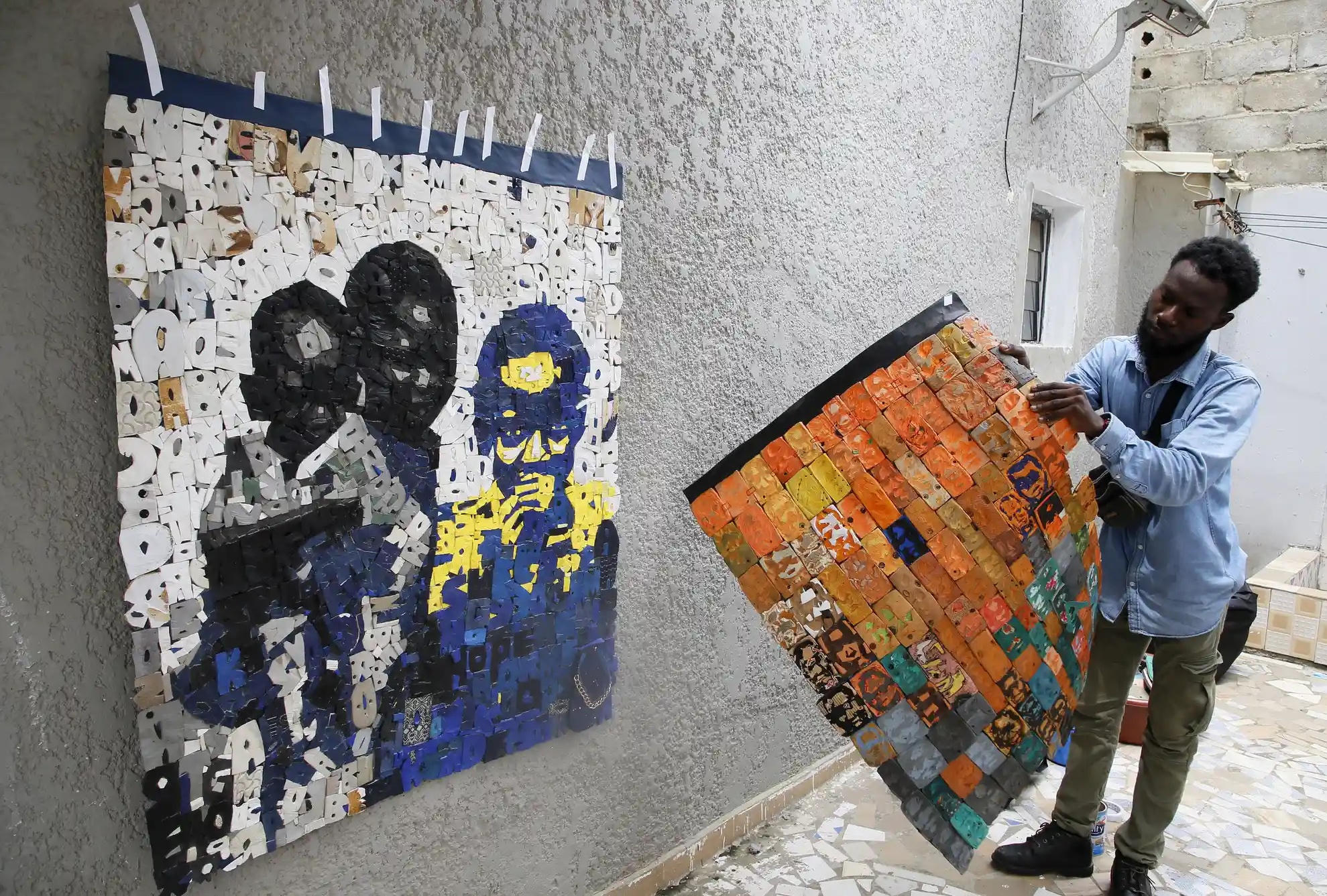 Nghệ sĩ Aristide Kouame đang tạo tác phẩm từ dép xỏ ngón vứt đi được thu thập từ một bãi biển ở Abidjan (Bờ Biển Ngà). Ảnh: Legnan Koula/EPA.