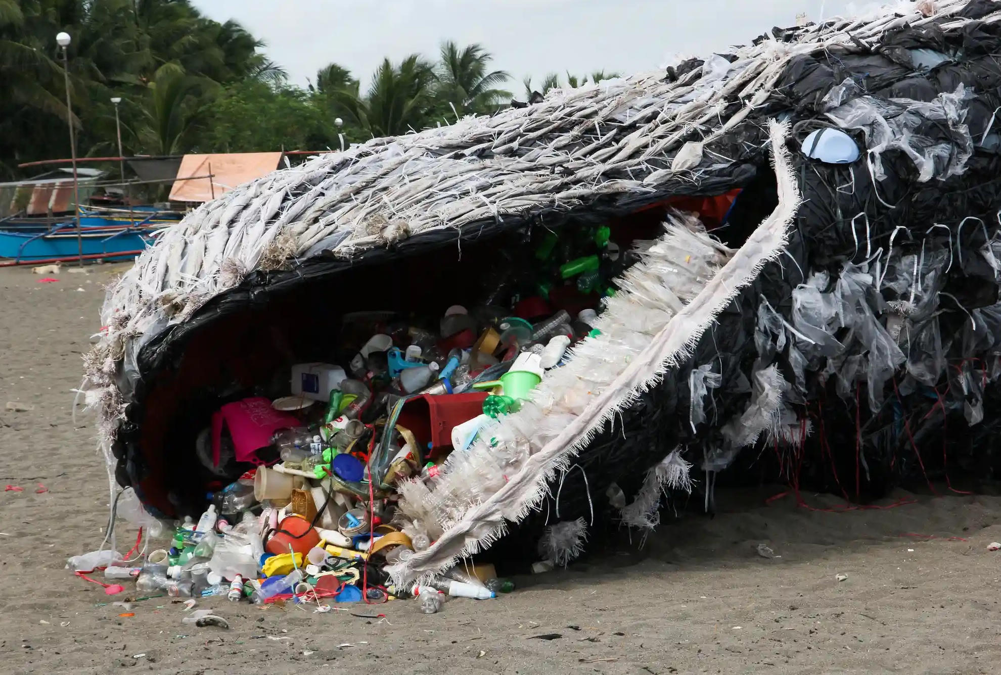 Tác phẩm điêu khắc một con cá voi chết do nhựa trên một bãi biển ở Naik (Manila) vào năm 2017. Ảnh: Greenpeace.