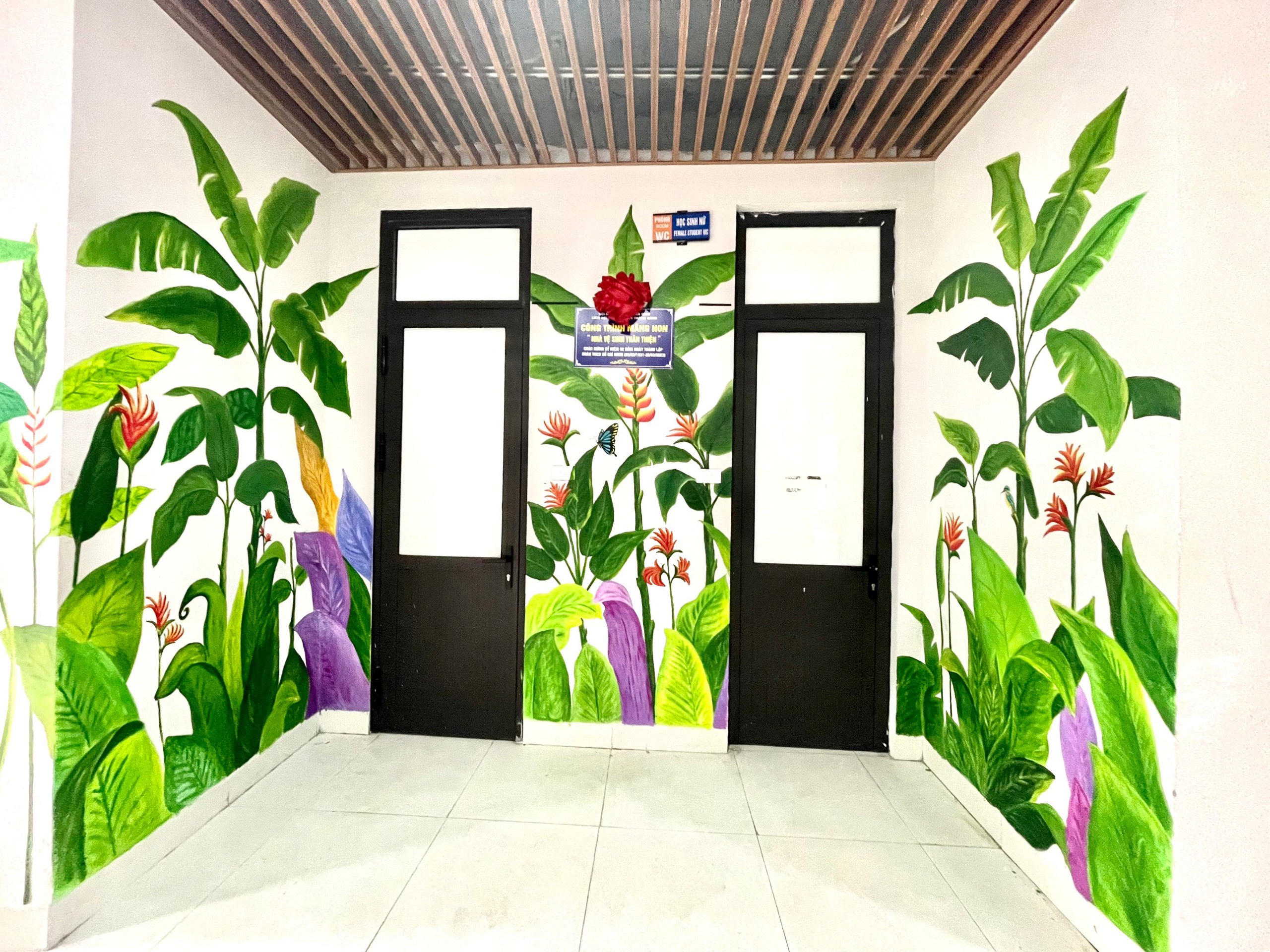 Thầy cô giáo và học sinh tô điểm cho nhà vệ sinh thân thiện.