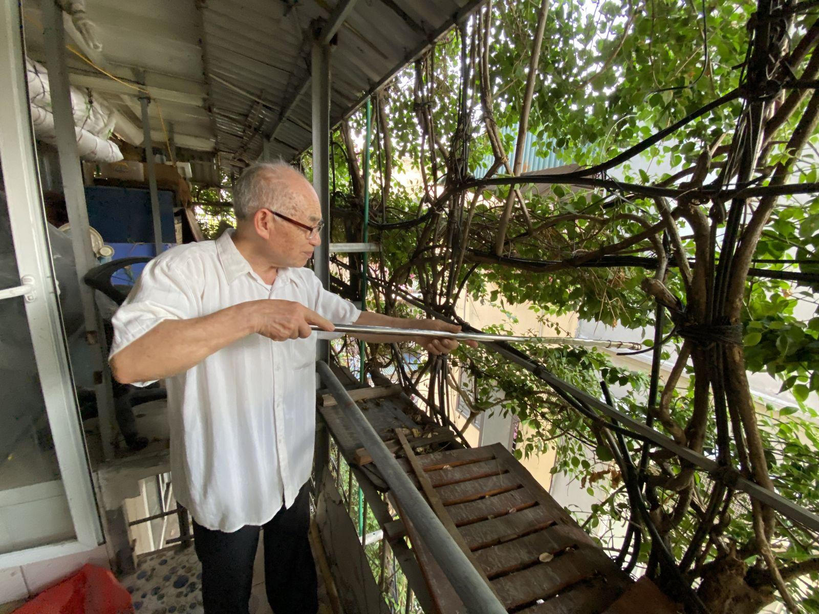 Để không bị ảnh hưởng tới hàng xóm xung quanh, ông Tầng tự chế công cụ riêng để cắt tỉa vào thời gian rảnh rỗi.