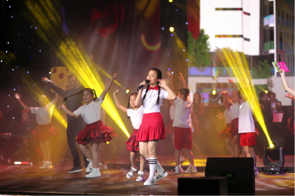 Tiết mục “Em yêu trường em” nói về hệ thống trường Sunshine School, do bé Kim Anh The Voice Kids cùng tốp múa Grammy Kids thể hiện. |