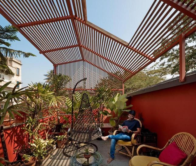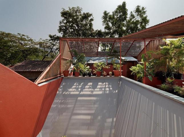 Sân thượng chung được tiếp nối với sân thượng mở rộng, nơi trồng những chậu cây và có tầm nhìn ra khu vườn ở tầng trệt. Do sân thượng chịu ánh nắng trực tiếp gay gắt, nên các bức tường của sân thượng được sơn màu đỏ nâu để giảm thiểu độ chói và tạo không gian thoải mái cho nơi ở.
