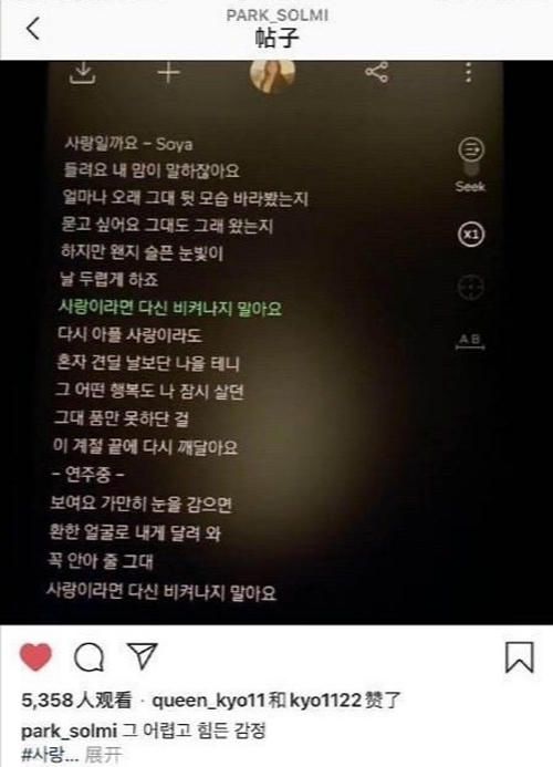 Park Sol Mi, bạn thân Song Hye Kyo, liên tục có dấu hiệu úp mở, gây tò mò về mối quan hệ của Song Hye Kyo - Hyun Bin. Gần đây, cô đăng một bài hát nhạc phim "Thế giới họ đang sống". Bộ phim đã chiếu được nhiều năm, vì thế động thái liên tục nhắc lại chuyện cũ của Park Sol Mi gợi lên nhiều tò mò.