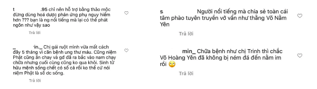 Nhiều ý kiến cho rằng việc tích cực chia sẻ những thông điệp Phật pháp hay khuyến khích ăn chay là đúng và được hoan nghênh. Nhưng, điều đó không có nghĩa có thể phân tích mọi sự việc trên đời bằng Phật pháp. Cho đến hiện tại, chưa có một nghiên cứu khoa học nào chứng minh được rằng niệm Phật có thể chữa khỏi được ung thư. Bởi lẽ đây là căn bệnh cực kì nguy hiểm, đến cả những máy móc và phương pháp hiện đại nhất hiện nay cũng khó có thể chữa khỏi. Ấy vậy mà Angela Phương Trinh lại kêu gọi mọi người chia sẻ cách trị ung thư hết sức vô lý và không có cơ sở khẳng định chắc chắn là sẽ giúp con người lành bệnh.