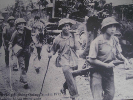 Ảnh đen trắng chụp những người lính hành quân về Quảng Trị. Nền ảnh là con đường ngổn ngang những chiếc xe ô tô của giặc Mỹ bị cháy. Những người lính trẻ dù trên vai trĩu nặng những bộ phận của một khẩu pháo, nhưng gương mặt đều tươi sáng rạng ngời: