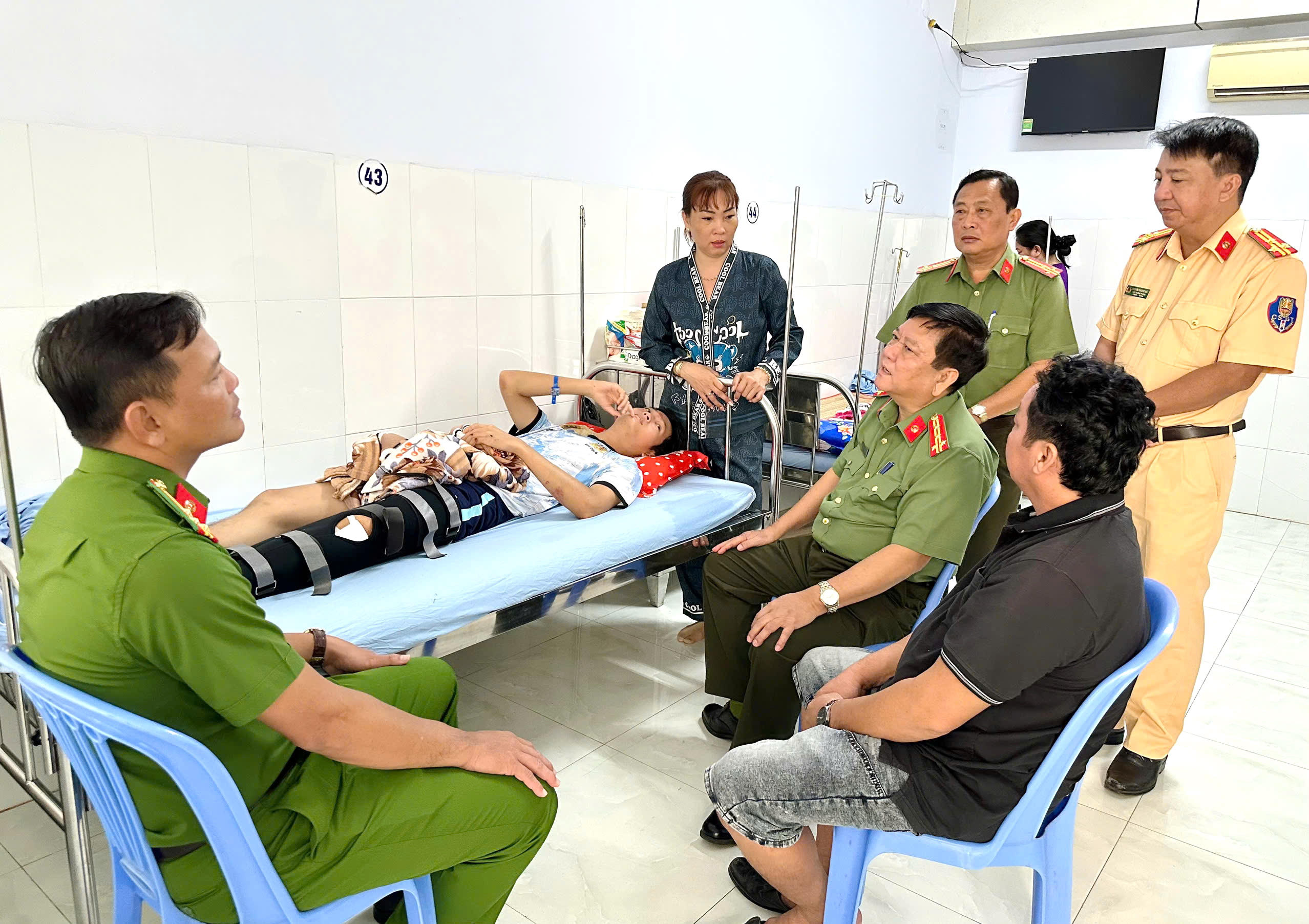 (PLVN) - Đại tá Trương Công Dũng - Phó Giám đốc Công an tỉnh Bạc Liêu mới đến Bệnh viện Đa khoa Bạc Liêu thăm hỏi sức khỏe, động viên tinh thần Binh nhất Trương Quốc Thái (chiến sĩ nghĩa vụ thuộc Phòng Cảnh sát cơ động tỉnh) bị thương trong quá trình hỗ trợ tuần tra, kiểm soát và xử lý vi phạm trật tự an toàn giao thông trên địa bàn.