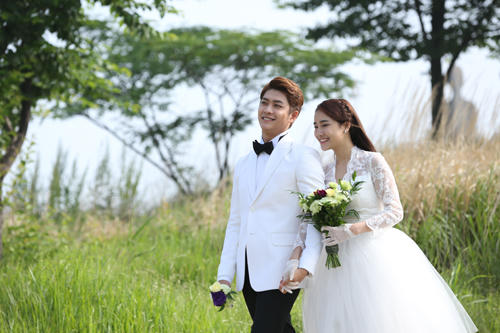 Nhã Phương và Kang Tae Oh thoải mái thể hiện cử chỉ yêu thương khi vào vai cô dâu - chú rể. |