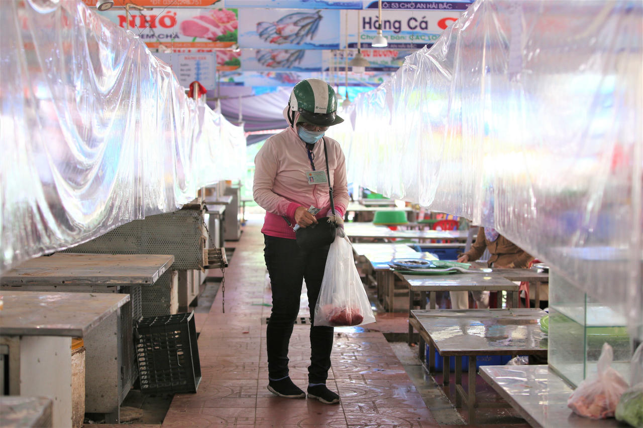Theo quan sát, bên trong chợ tại các "vùng xanh" được bố trí vách ngăn giữa tiểu thương và người mua hàng để đảm bảo an toàn phòng chống dịch. |