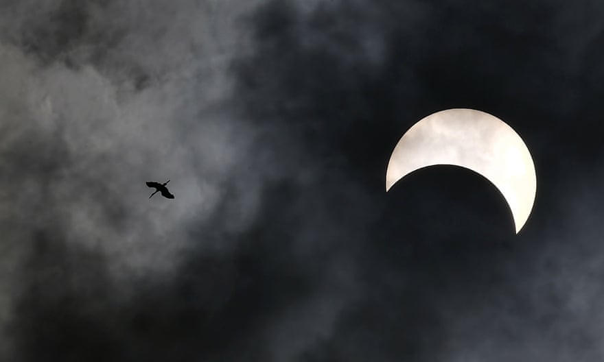 Một con chim bay qua khi mặt trăng di chuyển trước mặt trời, ở Bangkok
