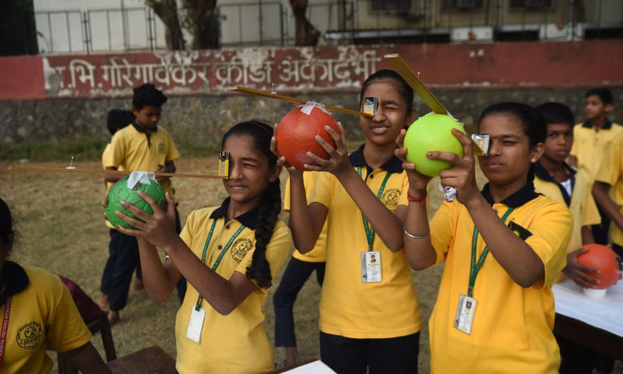 Học sinh sử dụng thiết bị quan sát nhật thực tự chế để xem nhật thực vòng tròn lửa hiếm hoi tại một trường học ở Mumbai