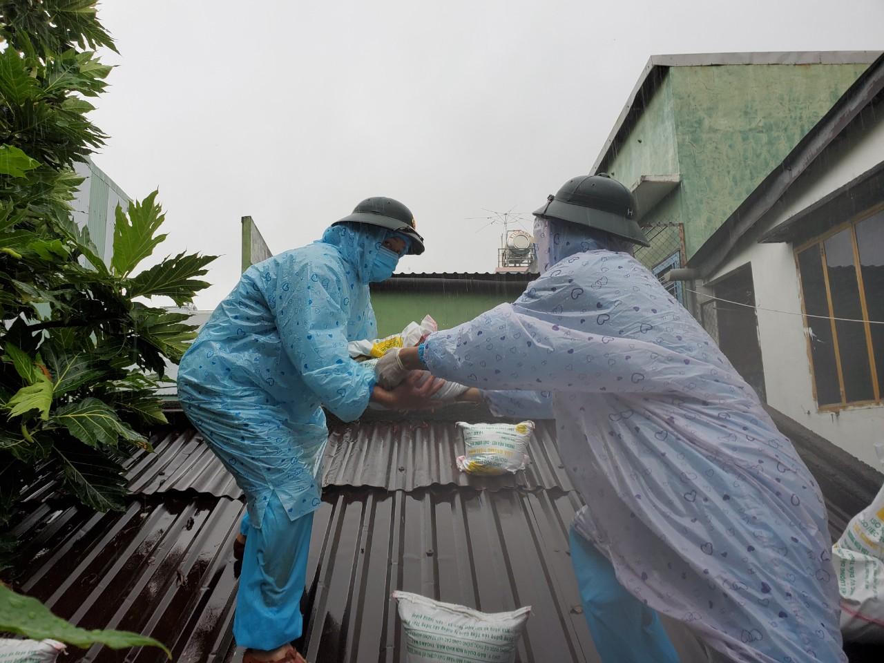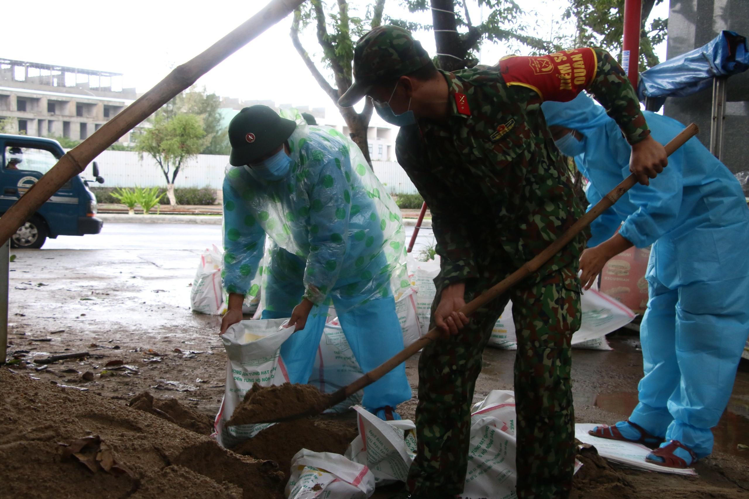 Tại các khu vực vùng đỏ (vùng phong tỏa cứng vì dịch COVID-19) nằm trên địa bàn quận Thanh Khê, gần 50 cán bộ, chiến sĩ thuộc Trung đoàn 971 - Bộ CHQS TP. Đà Nẵng đội mưa giúp những nhà dân chằng chống lại nhà cửa để hạn chế thiệt hại khi bão số 5 đổ bộ.