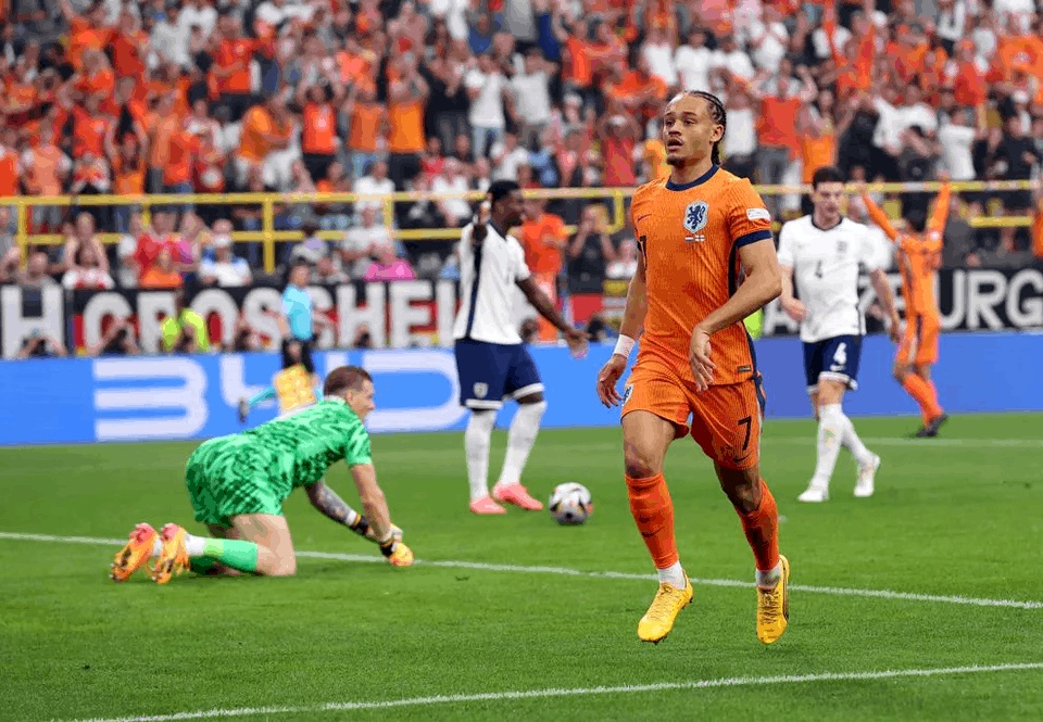 Phút thứ 7, Hà Lan có bàn thắng dẫn trước với siêu phẩm của Simon. Sau sai lầm của Declan Rice. Simons đã cướp được bóng và tung ra cú dứt điểm từ khoảng cách hơn 20m đánh bại Jordan Pickford mở tỷ số trận đấu.
