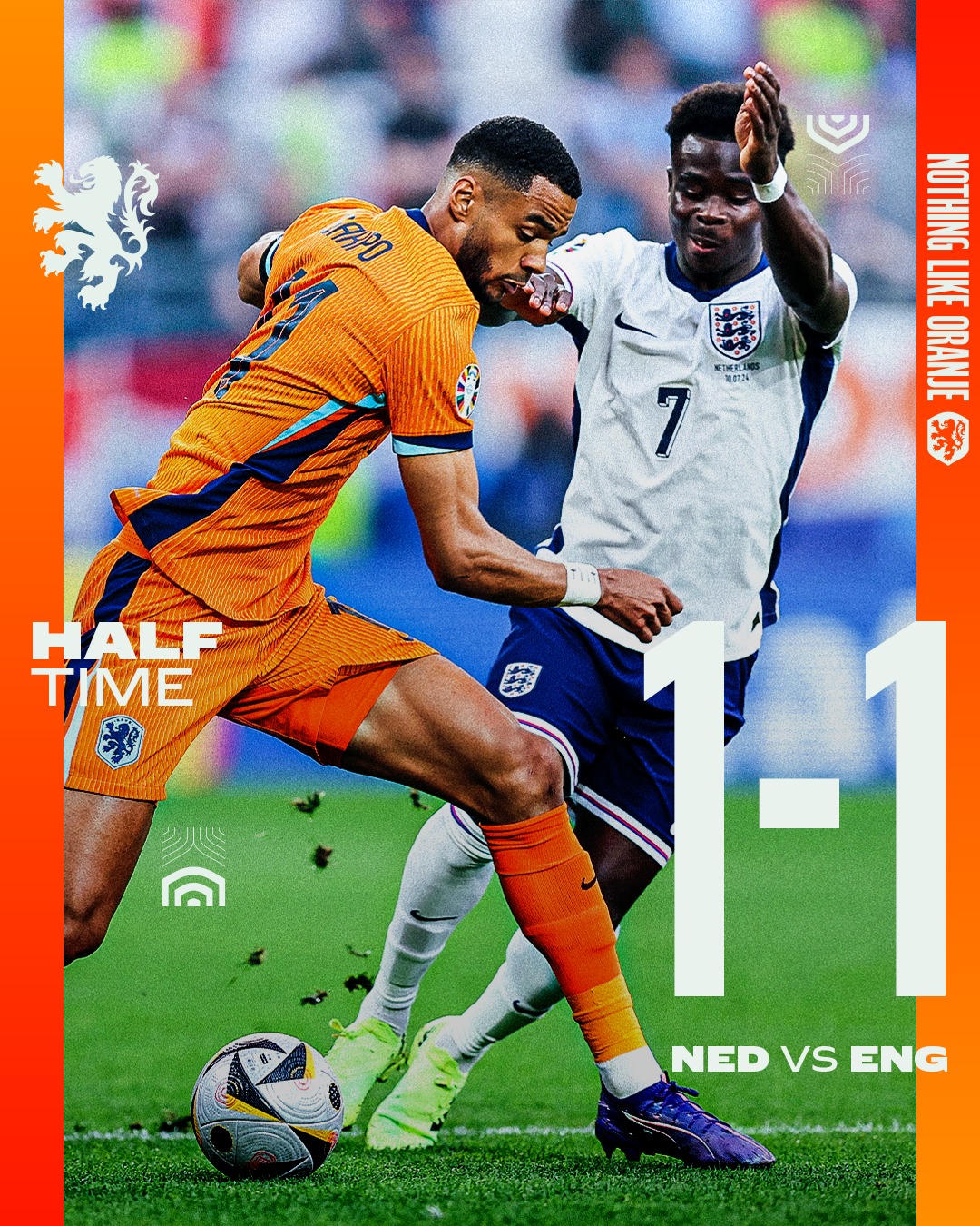 Ngay sau đó đội tuyển Anh có bàn thắng gỡ hoà. Trọng tài check VAR tình huống Dumfries kê chân Harry Kane trong vòng cấm. Ông cho tuyển Anh hưởng quả phạt 11 mét và Kane thực hiện thành công. Tỷ số là 1-1.