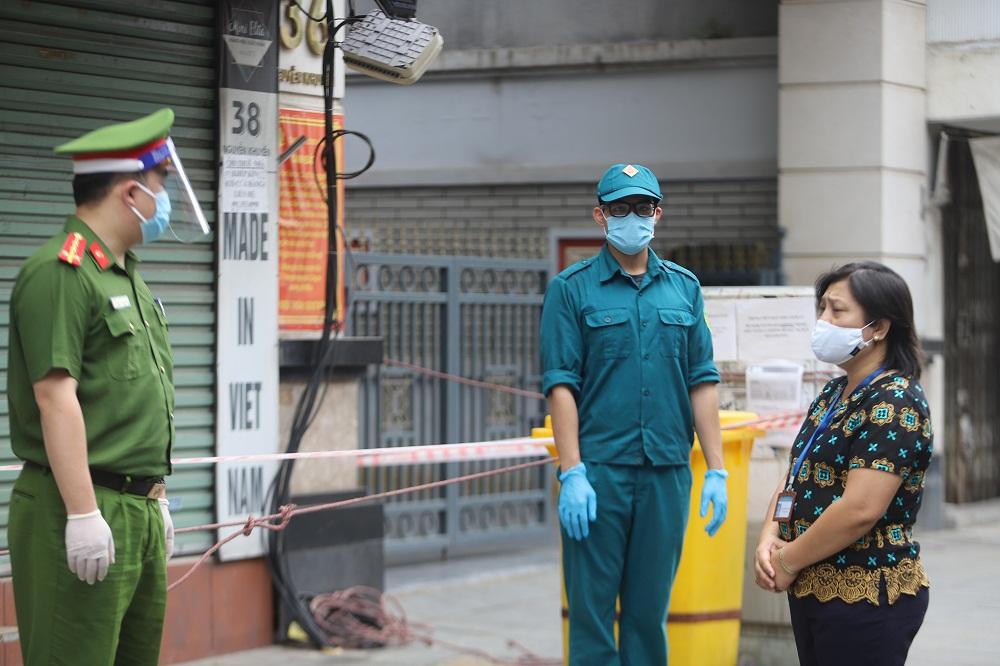 Chủ tịch UBND phường Văn Miếu (quận Đống Đa) Nguyễn Thị Vân Anh (bên phải) kiểm tra việc thực hiện nhiệm vụ tại khu vực cách ly y tế.