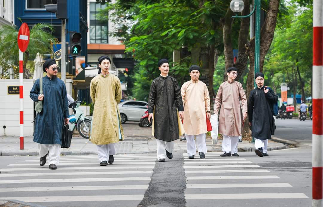 Ông Hải chia sẻ, việc mặc áo dài truyền thống của nữ giới đã có từ lâu, còn đối với nam giới thì chuyện chọn áo dài ngũ thân, khăn đóng làm trang phục truyền thống là phù hợp. Áo dài ngũ thân là trang phục ra đời tại Huế từ năm 1744 và vào thời Nguyễn đã lấy làm quốc phục, nghĩa là nó đã hoàn chỉnh và có hàng trăm năm lịch sử. Đó là di sản của người Việt Nam.