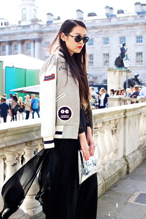 Áo Varsity jacket còn có thể mix theo phong cách lạ lẫm cùng váy maxi voan. Sự kết hợp trái ngược đem lại cảm giác lạ lẫm, mới mẻ cho người mặc.