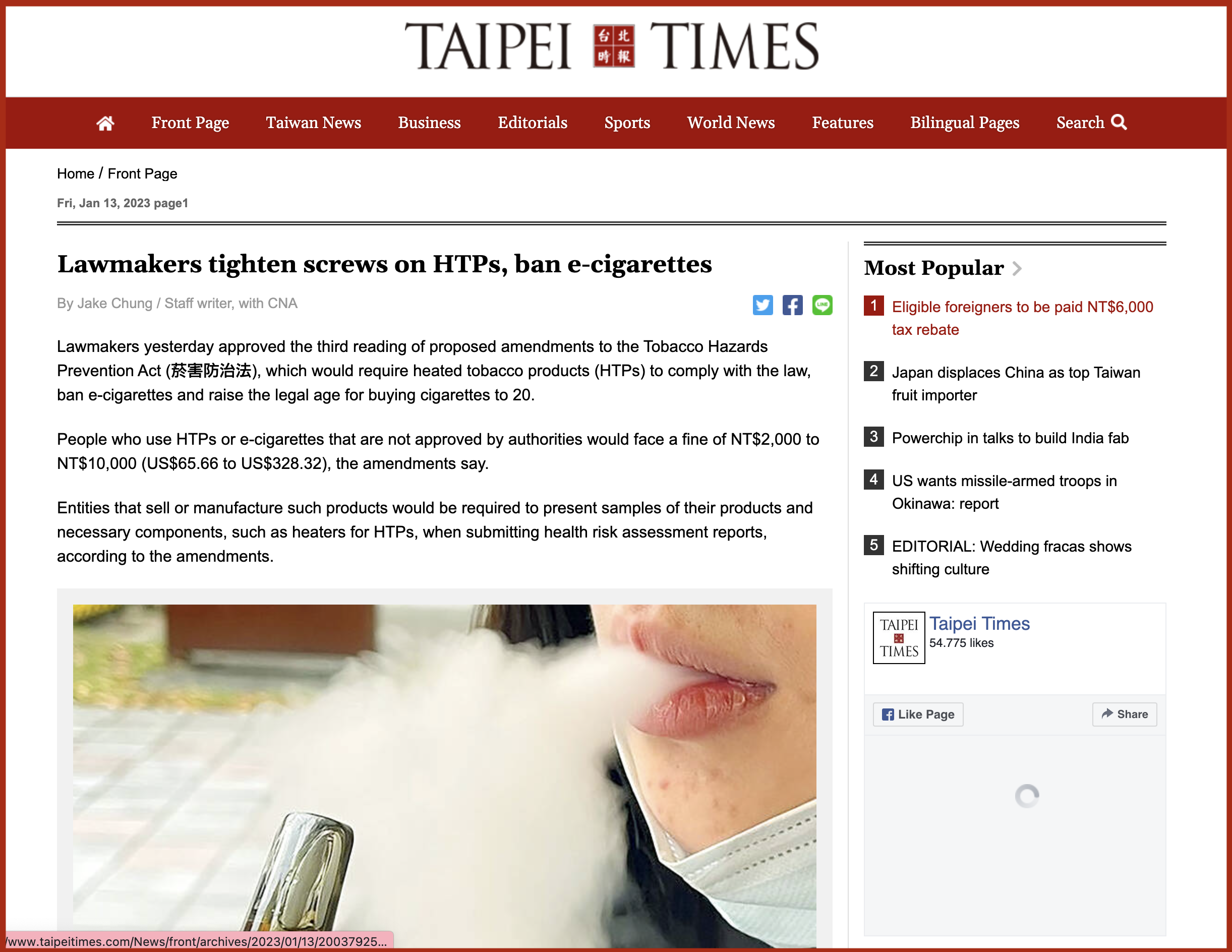 Luật sửa đổi cũng quy định các doanh nghiệp sản xuất, nhập khẩu, cung cấp hoặc quảng bá các sản phẩm thuốc lá hoặc TLLN mà không được chính quyền phê duyệt, sẽ phải đối mặt với mức phạt từ 10 triệu đến 50 triệu Đài tệ , những người vi phạm không phải là chủ doanh nghiệp sẽ bị phạt từ 50.000 đến 5 triệu Đài tệ, và những người sử dụng các sản phẩm TLLN hoặc TLĐT không được chính quyền phê duyệt sẽ bị phạt từ 2.000 đến 10.000 Đài tệ (khoảng 7,7 triệu đồng).