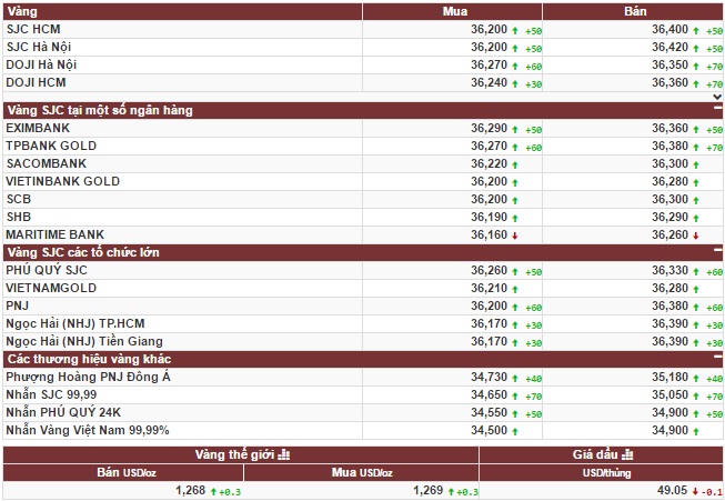 Trong khi đó, giá vàng của Tập đoàn Doji lẻ tại khu vực Hà Nội niêm yết ở mức giá 36,210 –36,280 triệu đồng/lượng (mua vào – bán ra), tăng 10.000 đồng lượng so với chốt phiên của ngày hôm trước.