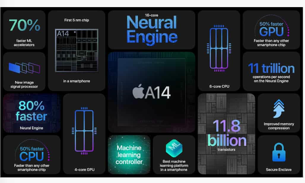 Chip A14 Bionic tương tự như trên iPad Air Pro, cho hiệu suất đồ họa nhanh hơn 50% so với bất kỳ chip điện thoại thông minh nào khác. |