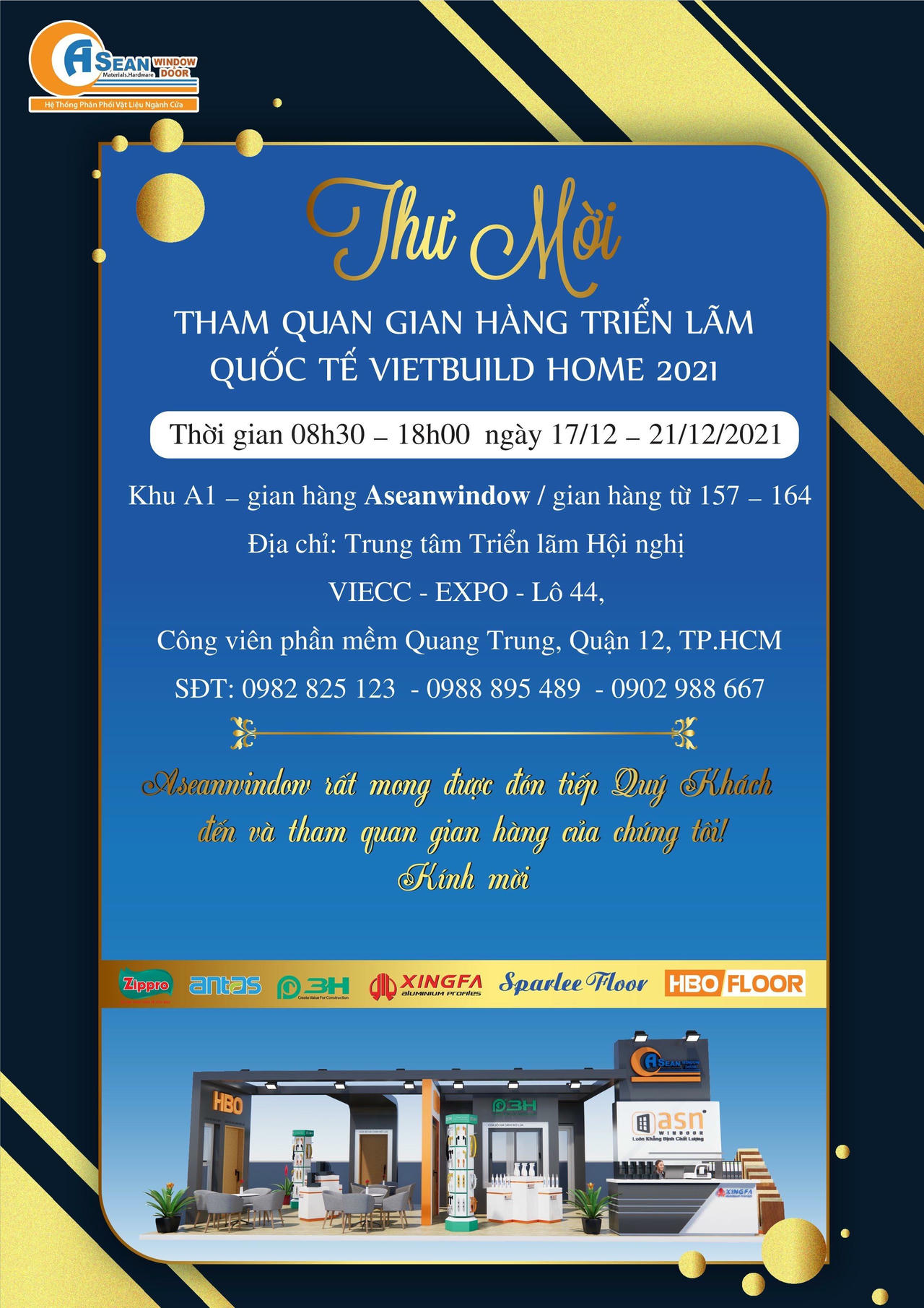 Ngày 17 - 21/12/2021 tới đây, tại Trung tâm Triển lãm Hội nghị VIECC - EXPO - Lô 44, Công viên phần mềm Quang Trung, Quận 12, TP HCM, Aseanwindow sẽ tham gia Hội chợ Triển lãm quốc tế Vietbuild TP HCM 2021, hứa hẹn mang đến sản phẩm có giá trị tốt nhất cho người tiêu dùng.