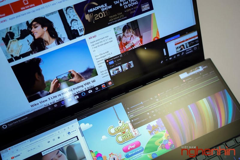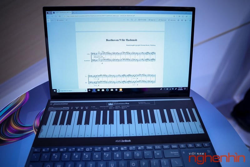 Nhìn sang chiếc MacBook Pro Touch Bar, có thể nói màn hình phụ trên chiếc máy tính của Apple chẳng là gì so với Asus. Khác với Touch Bar, ScreenPad Plus không chiếm đi hàng phím chức năng, bàn phím của ZenBook Pro Duo vẫn đầy đủ phím bấm và vẫn có một trackpad nhỏ bên phải. Bạn vừa có thể duyệt web trên màn hình chính, vừa quan sát các app nghe nhạc, xem ảnh phía dưới mà không phải chuyển đổi qua lại giữa các ứng dụng.