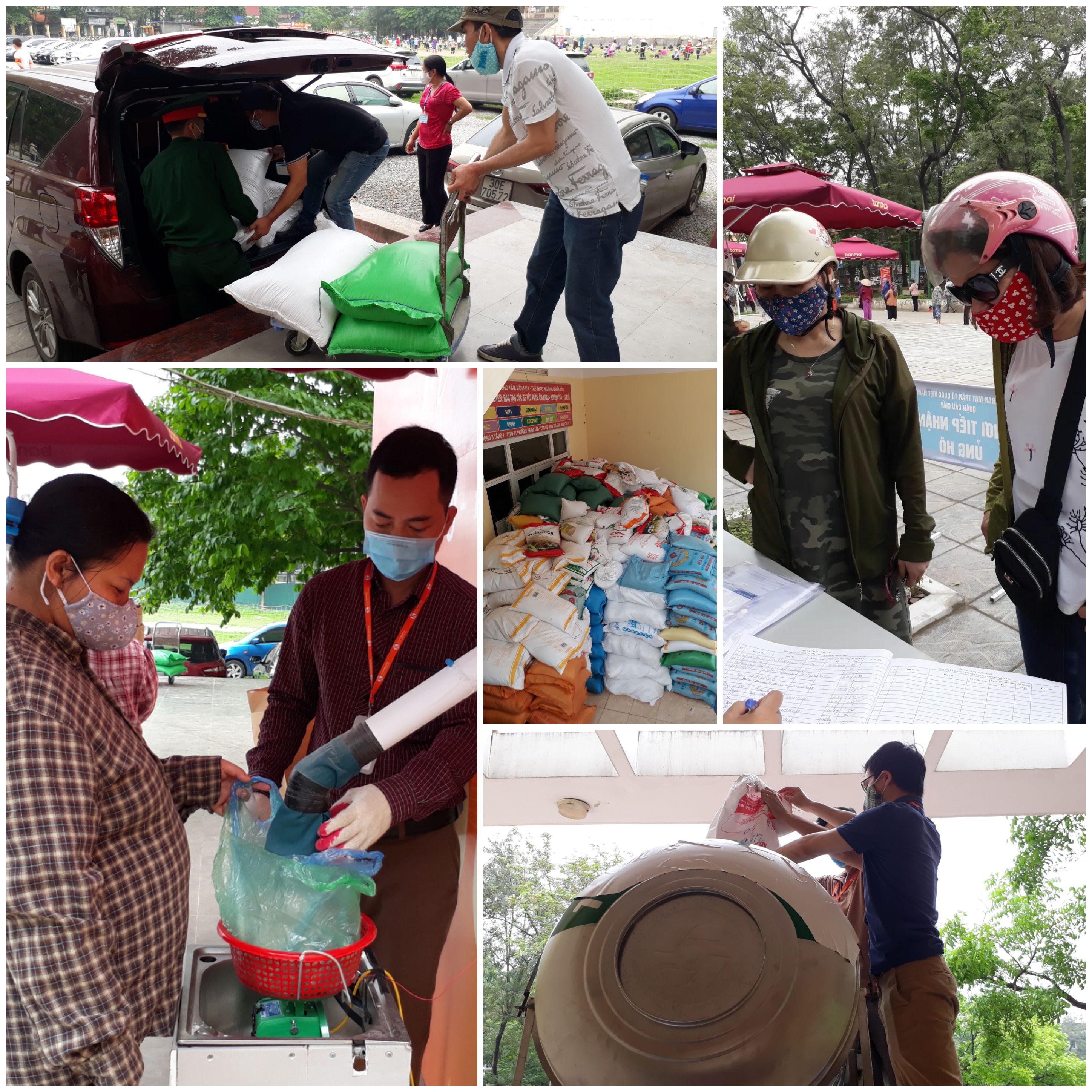 Trung bình mỗi ngày tại điểm nhà văn hóa phường Nghĩa Tân, ban tổ chức phát khoảng 4 tấn gạo, mỗi một người đến đây đều được nhận 3kg gạo. Đối với các trường hợp người già, người khuyết tật được ưu tiên không phải xếp hàng và phần quà có thêm trứng hoặc thực phẩm khác.