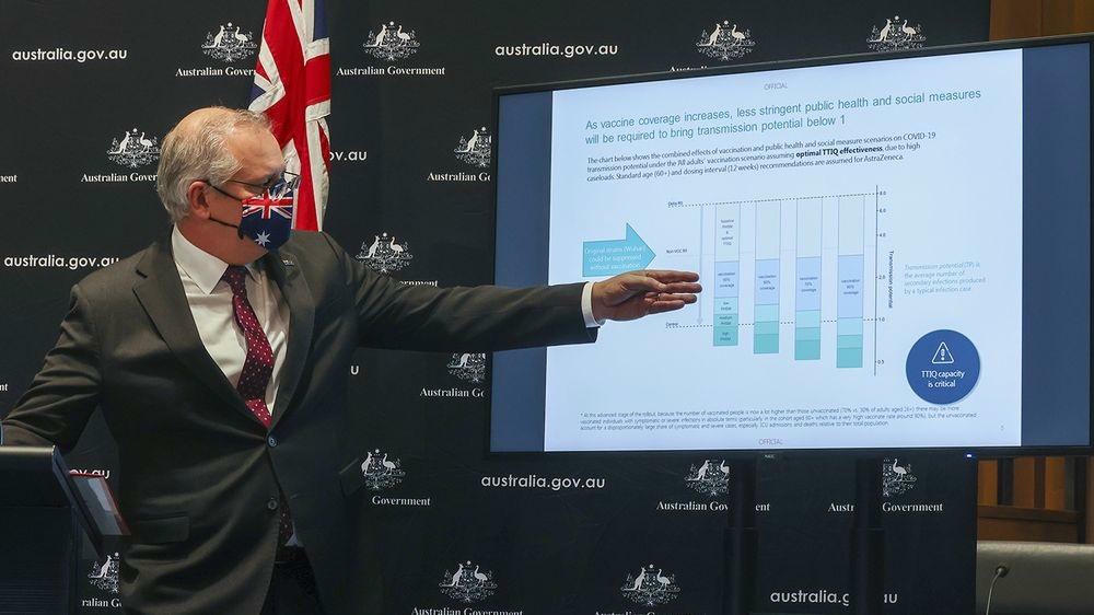 Thủ tướng Scott Morrison trình bày mô hình của Viện Doherty làm cơ sở cho kế hoạch của Chính phủ hướng dẫn Australia thoát khỏi đại dịch. Ảnh: Sydney Morning Herald |