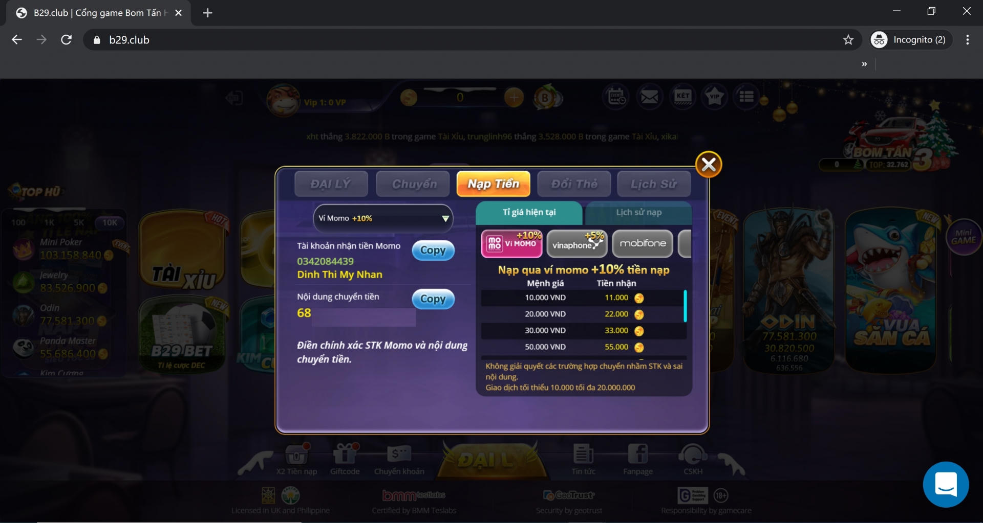 Con bạc có thể nạp tiền qua thẻ cào viễn thông, chuyển khoản hoặc ví Momo |