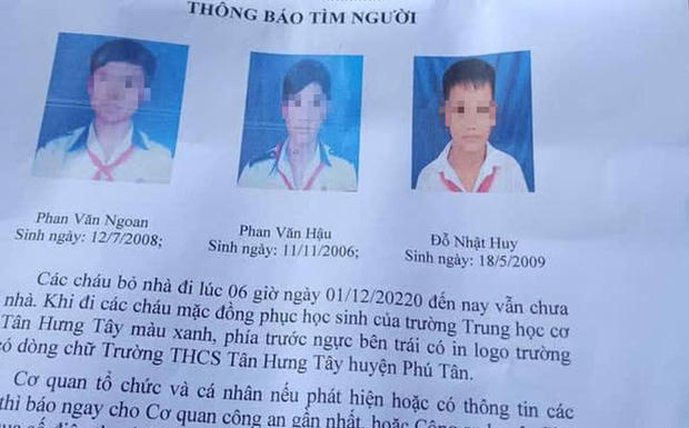 Trước đó, khi nhận được tin báo mất tích của gia đình, Công an huyện Phú Tân tích cực hỗ trợ tìm kiếm. Một tờ rơi thông báo tìm người có thông tin của ngành chức năng về việc tìm 3 bé được chia sẻ rộng rãi trên mạng xã hội.