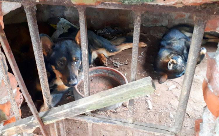 Đàn chó 9 con, trong đó 7 con trưởng thành được nhốt trong cũi của gia đình bà An. Ảnh: Phương Sơn |