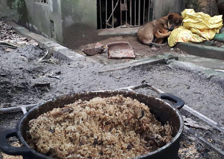 Chảo đồ ăn bà An chuẩn bị cho đàn chó ngày 5/4. Ảnh:Phương Sơn |