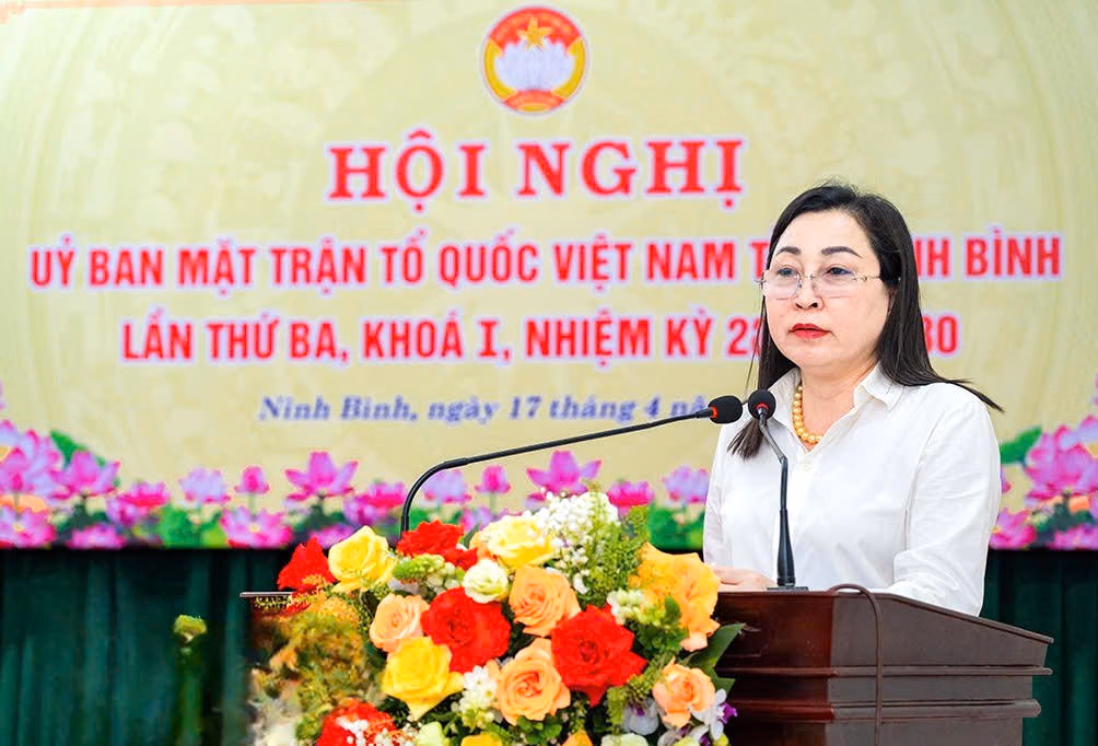 Tân Chủ tịch Ủy ban MTTQ Việt Nam tỉnh Ninh Bình Đinh Thị Lụa bày tỏ lòng tri ân sâu sắc tới các thế hệ lãnh đạo, cán bộ Mặt trận tỉnh qua các thời kỳ - những người đã tận tâm, trách nhiệm, kiên trì xây dựng nền tảng vững chắc và tích lũy, bồi đắp những kinh nghiệm thực tiễn quý báu, tạo tiền đề quan trọng cho sự phát triển bền vững của Mặt trận trong giai đoạn hiện nay.