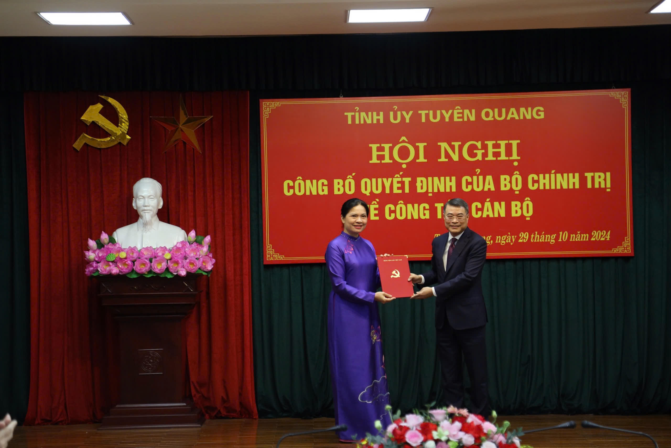 Ông Lê Minh Hưng, Uỷ viên Bộ Chính trị, Bí thư Trung ương Đảng trao quyết định của Bộ Chính trị phân công bà Hà Thị Nga giữ chức vụ Bí thư Tỉnh uỷ Tuyên Quang. |
