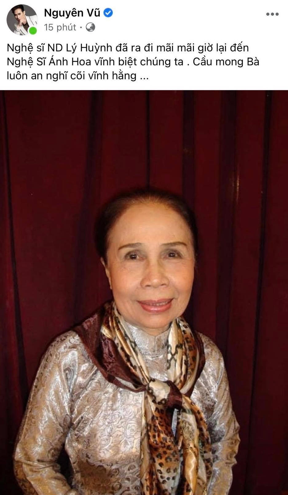 Chiều 1/11, dàn sao Vbiz vô cùng đau buồn thông báo tin NS Ánh Hoa đã ra đi mãi mãi ở tuổi 79. Gia đình NS Ánh Hoa cho biết bà qua đời tại nhà riêng vào lúc 12h ngày 1/11 sau thời gian chống chọi với căn bệnh tai biến mạch máu não. Tang lễ cố nghệ sĩ Ánh Hoa sẽ được diễn ra tại nhà riêng ở P. Tân Hưng, Quận 7. TP HCM. Lễ động quan lúc 8 giờ ngày 3/11, sau đó hoả táng tại Bình Hưng Hoà.