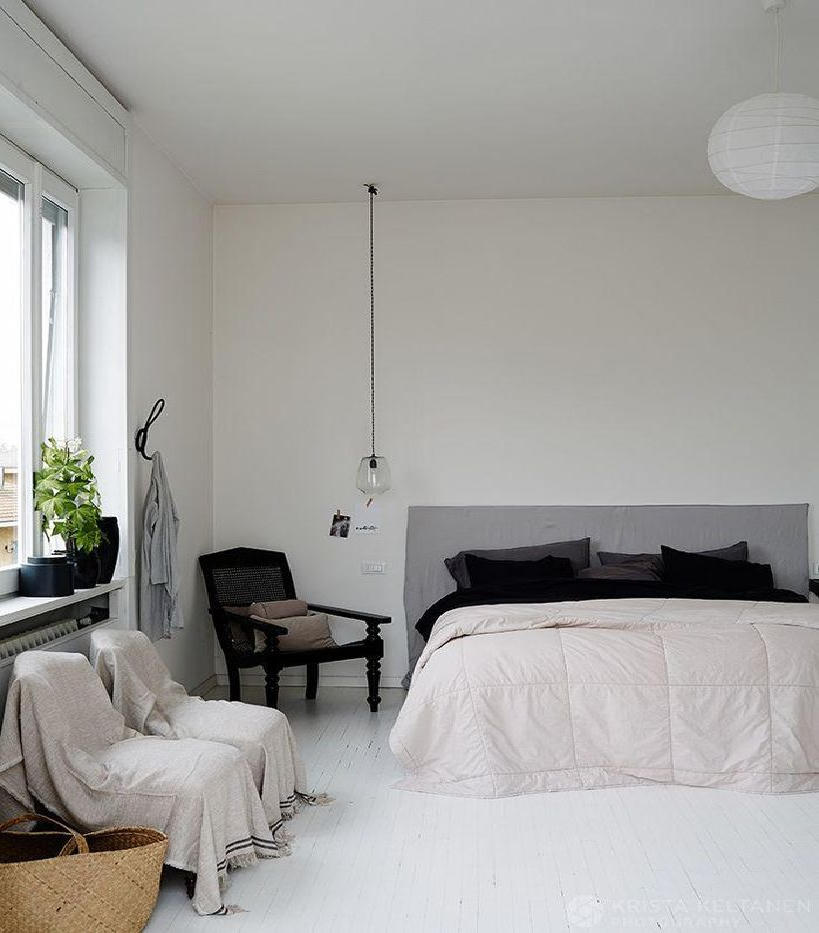 Phòng ngủ đơn giản nhưng thanh lịch với các món đồ nội thất tối giản. |