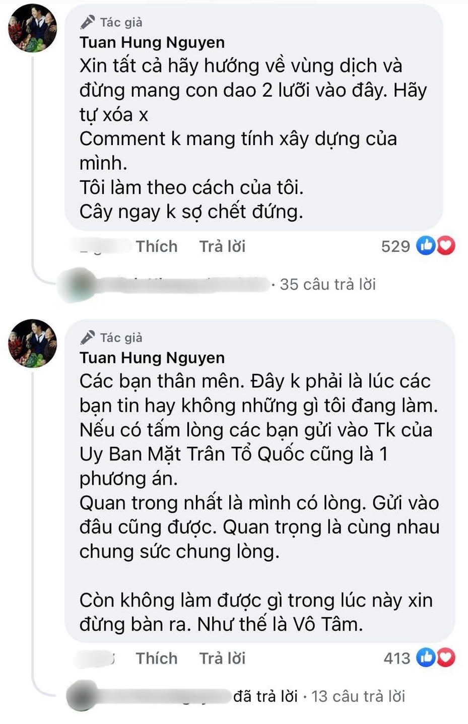 Tuấn Hưng nói thêm: "Các bạn thân mến. Đây không phải là lúc các bạn tin hay không những gì tôi đang làm. Nếu có tấm lòng các bạn gửi vào tài khoản của Ủy Ban Mặt Trận Tổ Quốc (MTTQ) cũng là 1 phương án. Quan trọng nhất là mình có lòng. Gửi vào đâu cũng được. Quan trọng là cùng nhau chung sức chung lòng. Còn không làm được gì trong lúc này xin đừng bàn ra. Như thế là vô tâm".